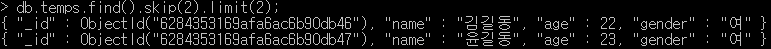 db.temps.insert({name: '김길동', age: 22, gender: '여'});