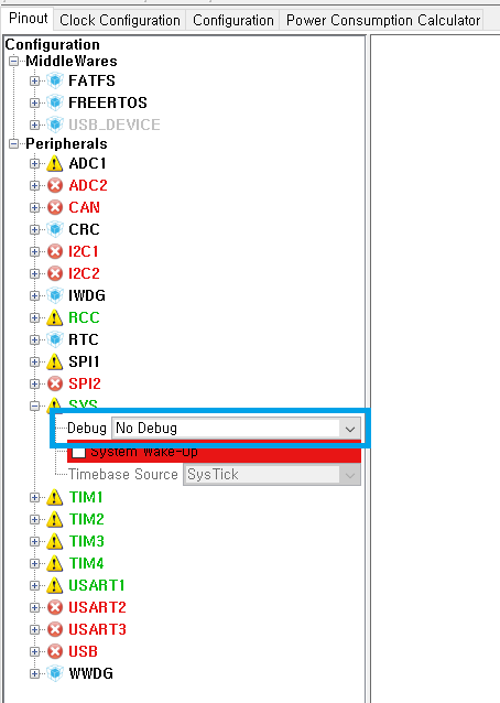 하지만 저 부분을 Default인 'No Debug'로 두면 JTAG 혹은 ST-LINK와 같은 디버깅 툴을 사용하지