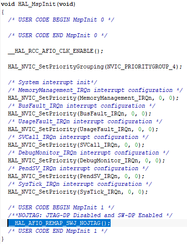 않는 것으로 간주하고, _HAL_AFIO_REMAP_SWJ_NOJTAG(); 코드를 생성해버린다.