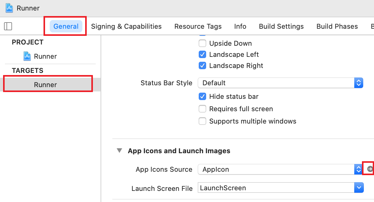 그럼 변경된 화면에서, TARGETS -> Runner -> General 탭 -> App Icons Source 우측의 화살표 모양을 클릭한다.