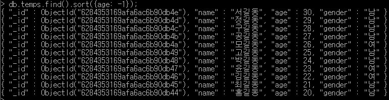 -1은 내림차순이지만 오름차순으로 정렬하고 싶다면 {age: 1}과 같은 형태로 사용하면 된다.