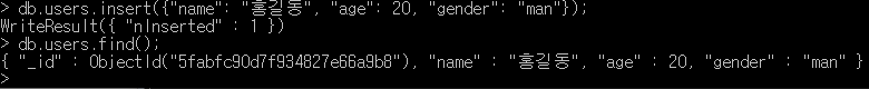> db.users.insert({"name": "홍길동", "age": 20, "gender": "man"});
