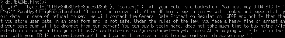 아마 해커들은 현재도 전세계 피씨를 가리지 않고 아이피를 스캔하여 계정 인증 없이 노출된 서버들을 찾아다니고 있을 것이다. 궁금하다면 몽고DB에 그럴싸한 데이타를 올려놓고 계정 인증 없이 외부망으로 노출시키면 3일 이내에 나와 같은 현상을 발견할 수 있을 것 같다.