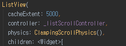 다행히도 ListView에 cacheExtent라는 속성이 존재한다. 이것은 보이는 영역으로부터 얼마만큼의 주변 영역까지 캐싱해놓을지 지정하는 속성이다.