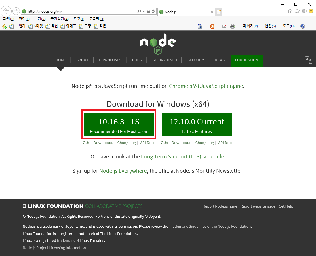 좌측에 있는 LTS 버전은 안정된 버전이라 보면 되며,