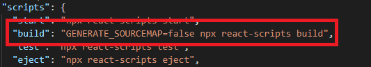 위와 같이 package.json 파일을 열면 build 부분에 GENERATE_SOURCEMAP를 false로 설정해준다.